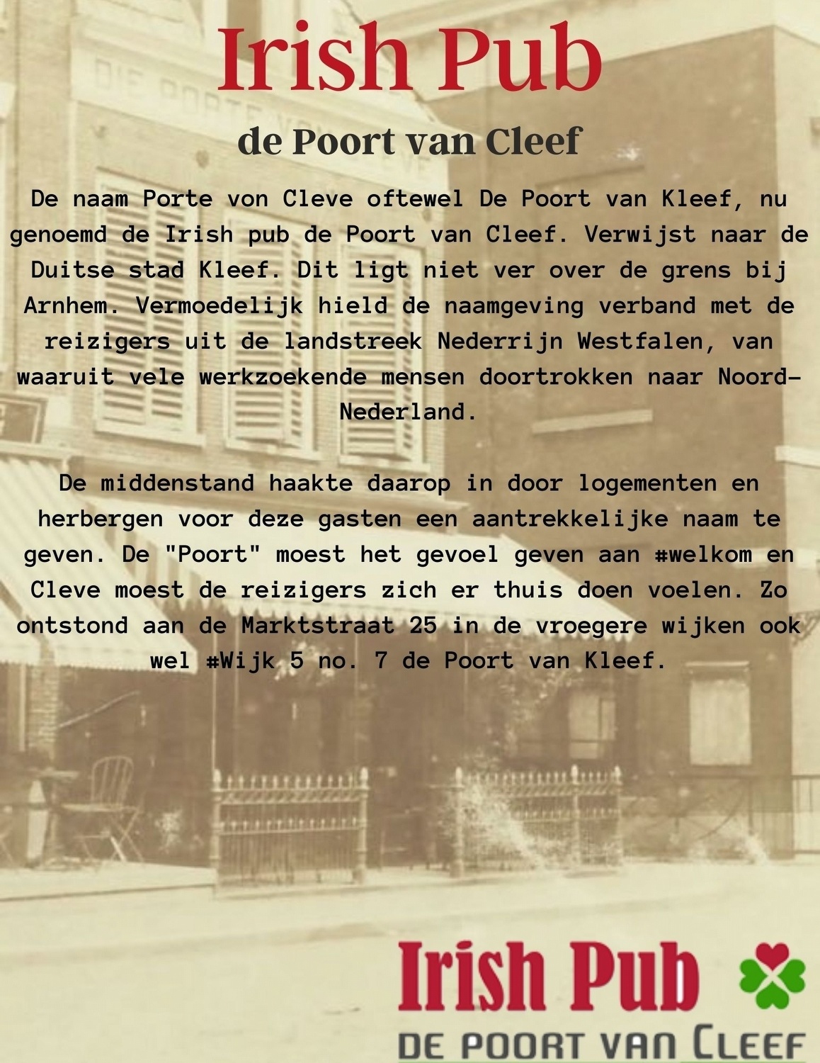 De naam Porte von Cleve oftewel De Poort van Kleef, nu genoemd de Irish pub de Poort van Cleef. Verwijst naar de Duitse stad Kleef. Dit ligt niet ver over de grens bij Arnhem. Vermoedelijk hield de naamgeving verband met de reizigers uit de landstreek Nederrijn Westfalen, van waaruit-vele werkzoekende mensen doortrokken naar Noord-Nederland.